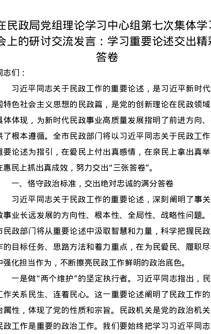 在民政局党组理论学习中心组第七次集体学习会上的研讨交流发言:学习重要论述交出精彩答卷