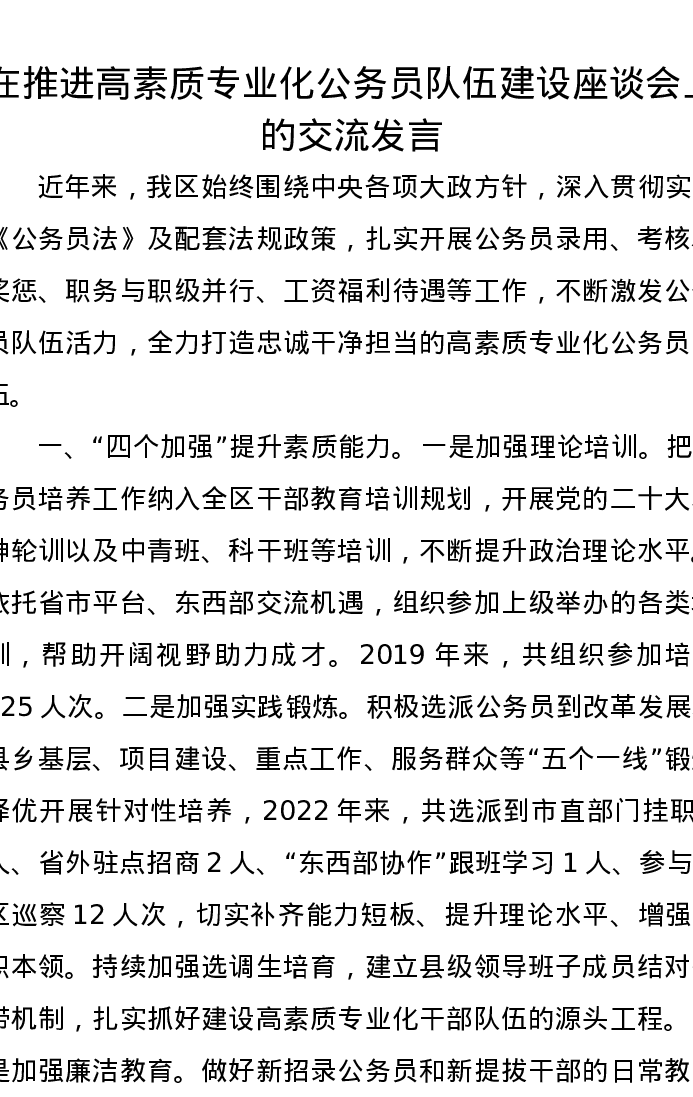 在推进高素质专业化公务员队伍建设座谈会上的交流发言