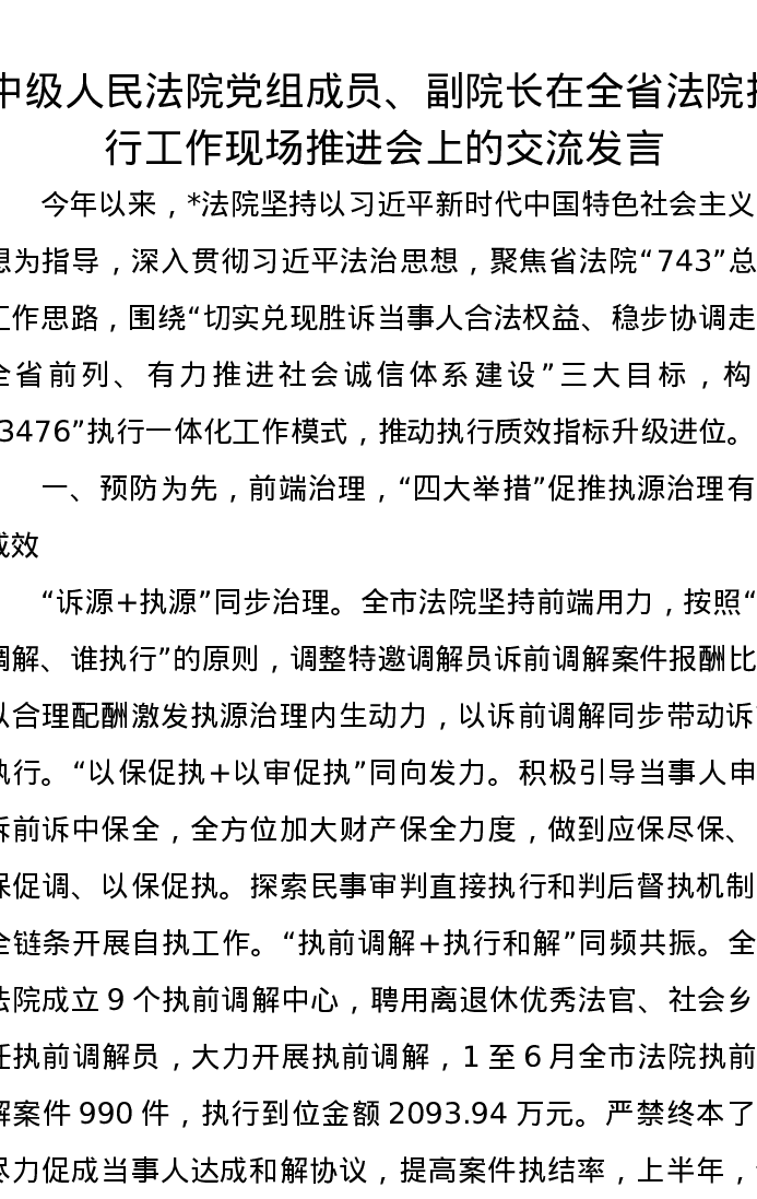 中级人民法院党组成员、副院长在全省法院执行工作现场推进会上的交流发言