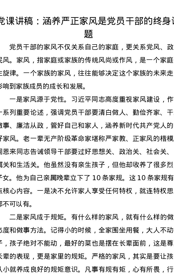 党课讲稿:涵养严正家风是党员干部的终身课题