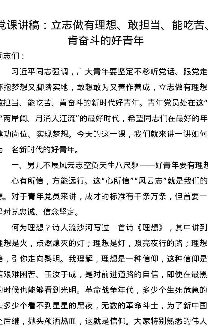 党课讲稿:立志做有理想、敢担当、能吃苦、肯奋斗的好青年