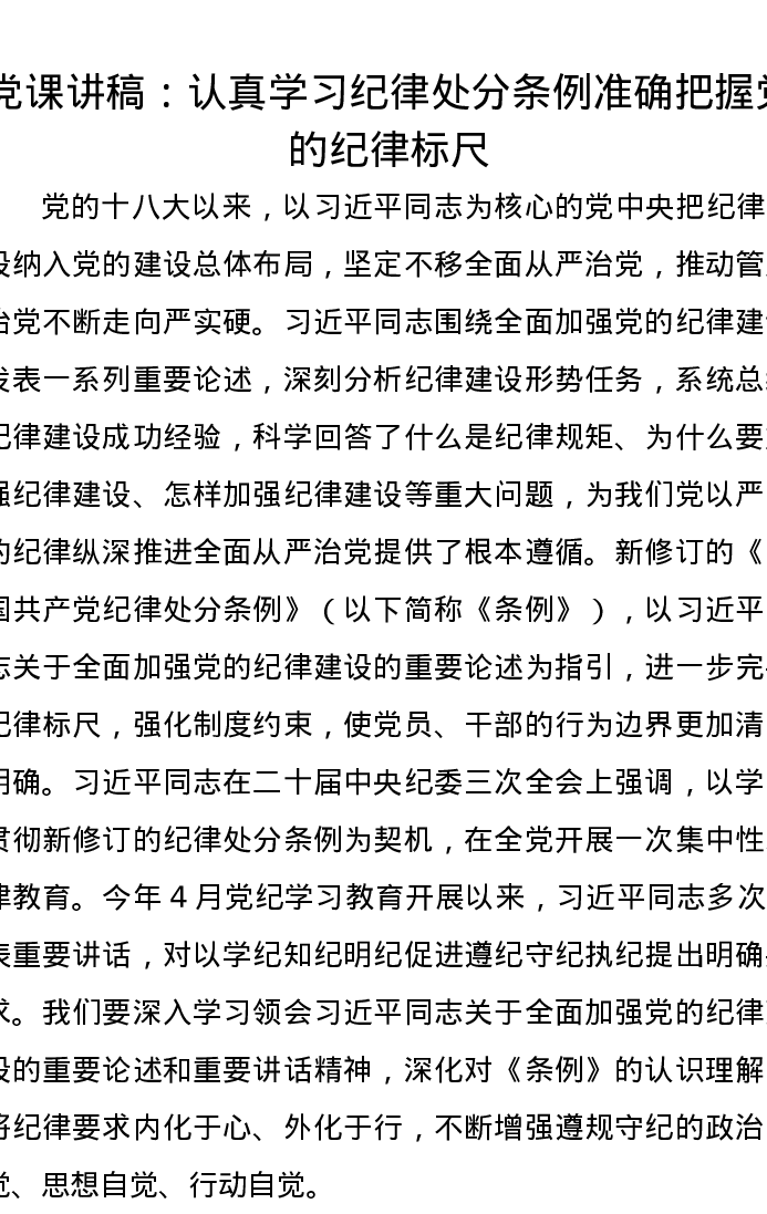 党课讲稿:认真学习纪律处分条例准确把握党的纪律标尺