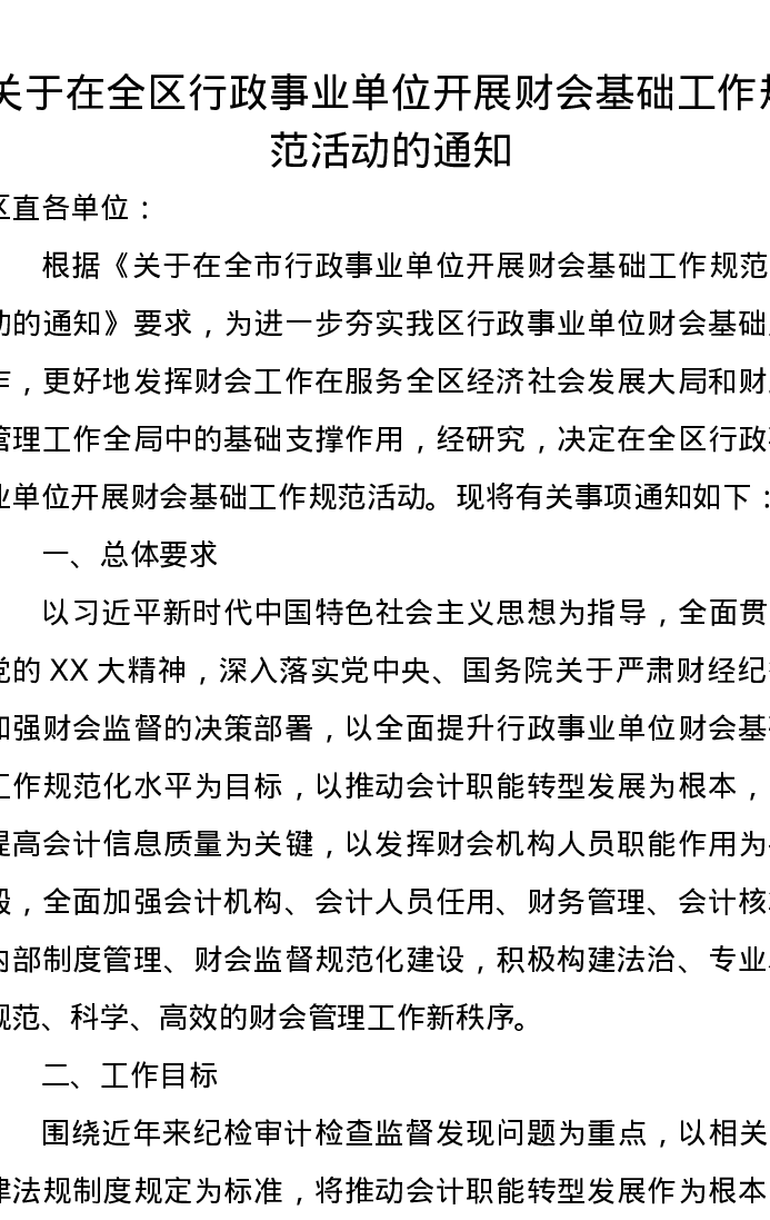 关于在全区行政事业单位开展财会基础工作规范活动的通知