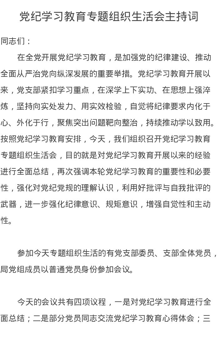 党纪学习教育专题组织生活会主持词