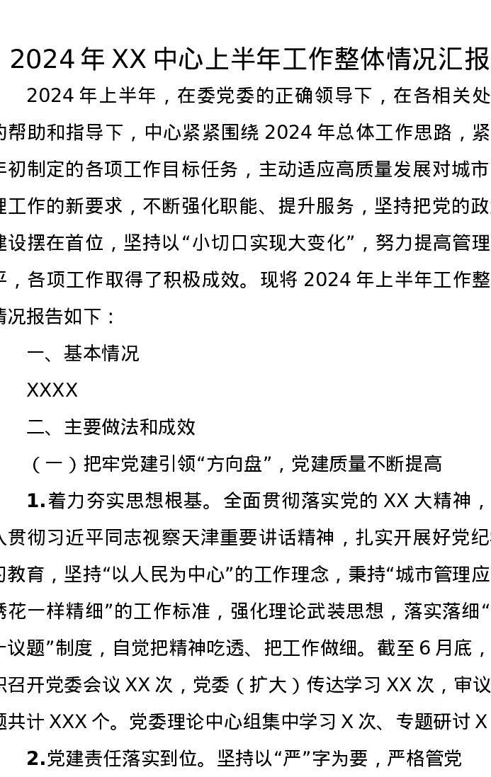2024年XX中心上半年工作整体情况汇报