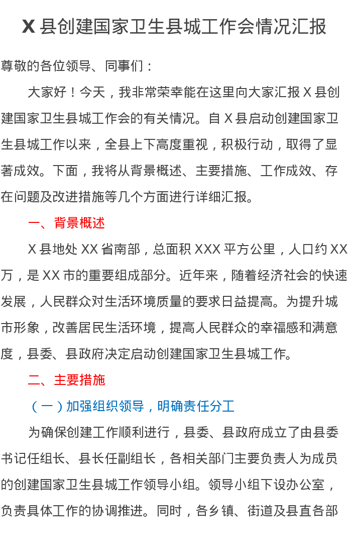 X县创建国家卫生县城工作会情况汇报