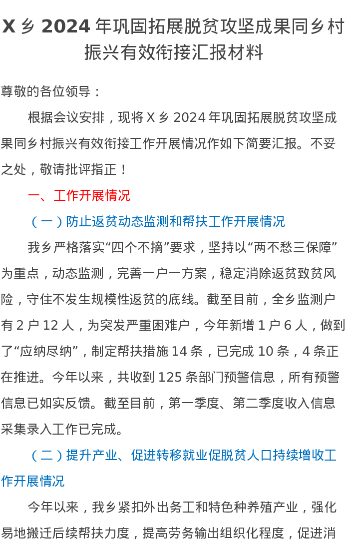 X乡2024年巩固拓展脱贫攻坚成果同乡村振兴有效衔接汇报材料