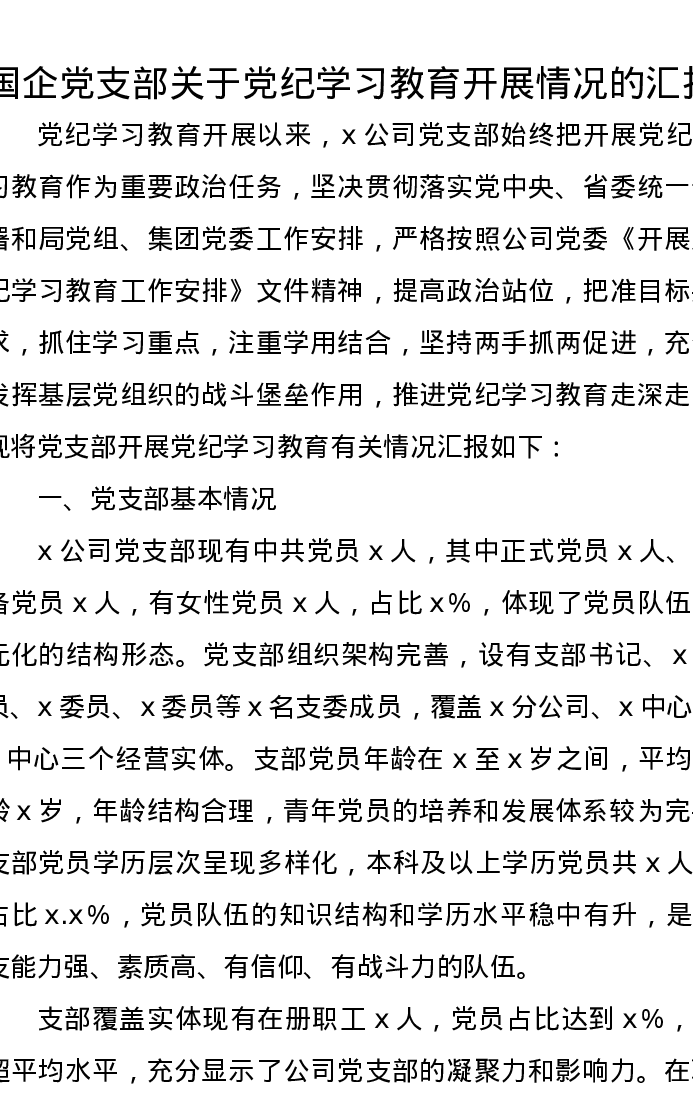 国企党支部关于党纪学习教育开展情况的汇报
