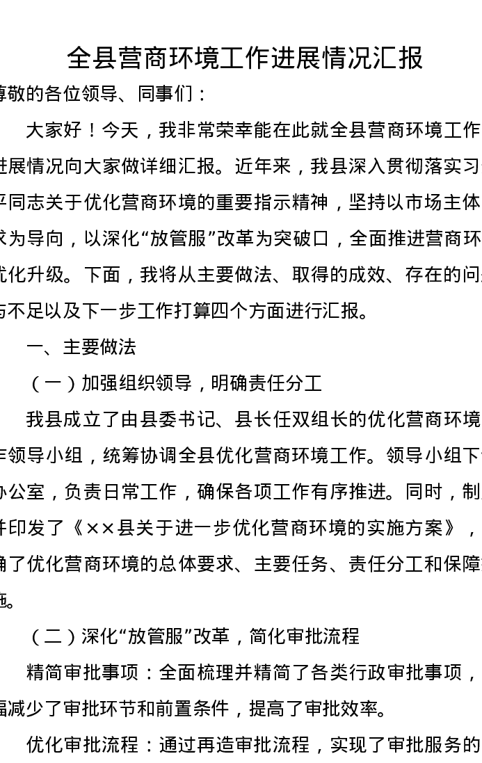 全县营商环境工作进展情况汇报
