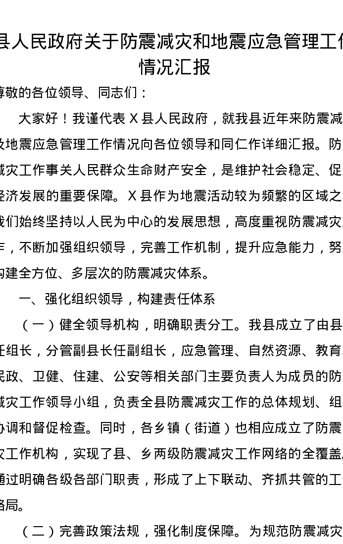 县人民政府关于防震减灾和地震应急管理工作情况汇报