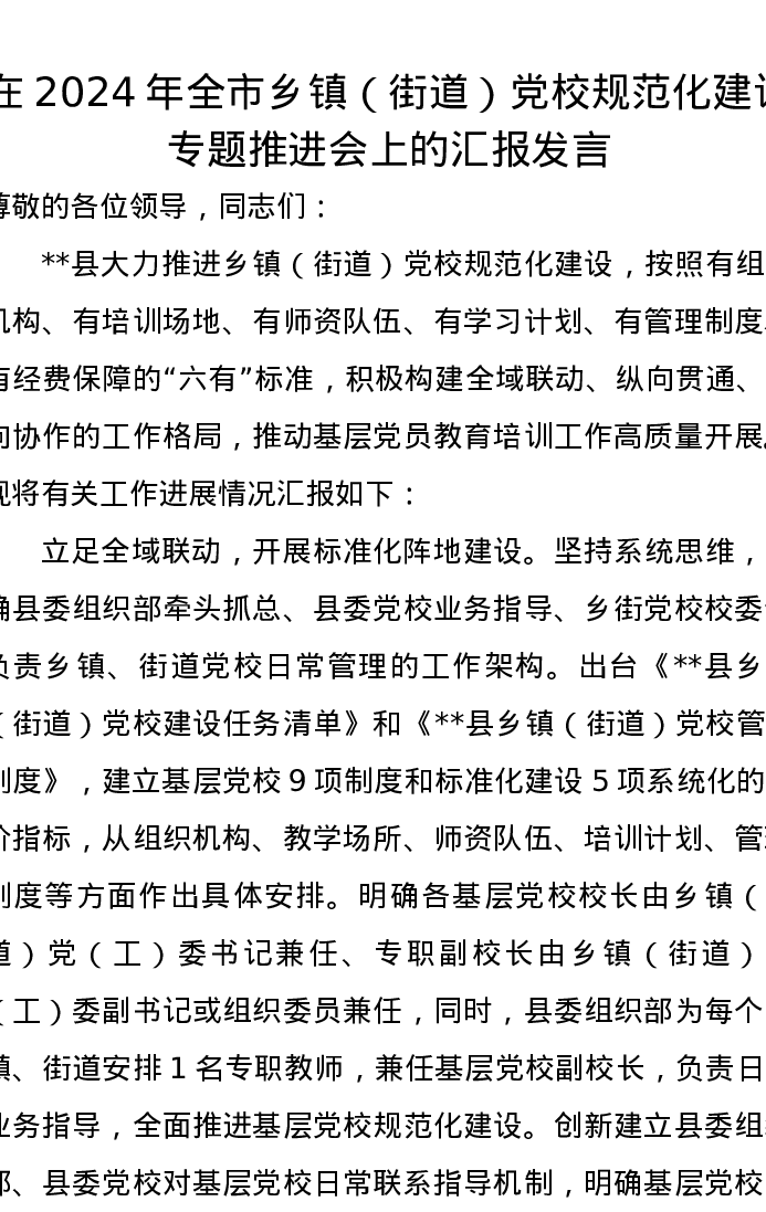 在2024年全市乡镇(街道)党校规范化建设专题推进会上的汇报发言