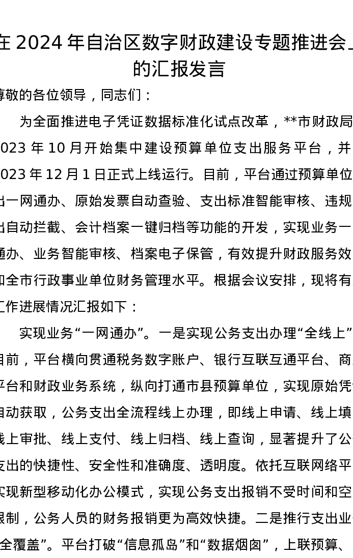 在2024年自治区数字财政建设专题推进会上的汇报发言