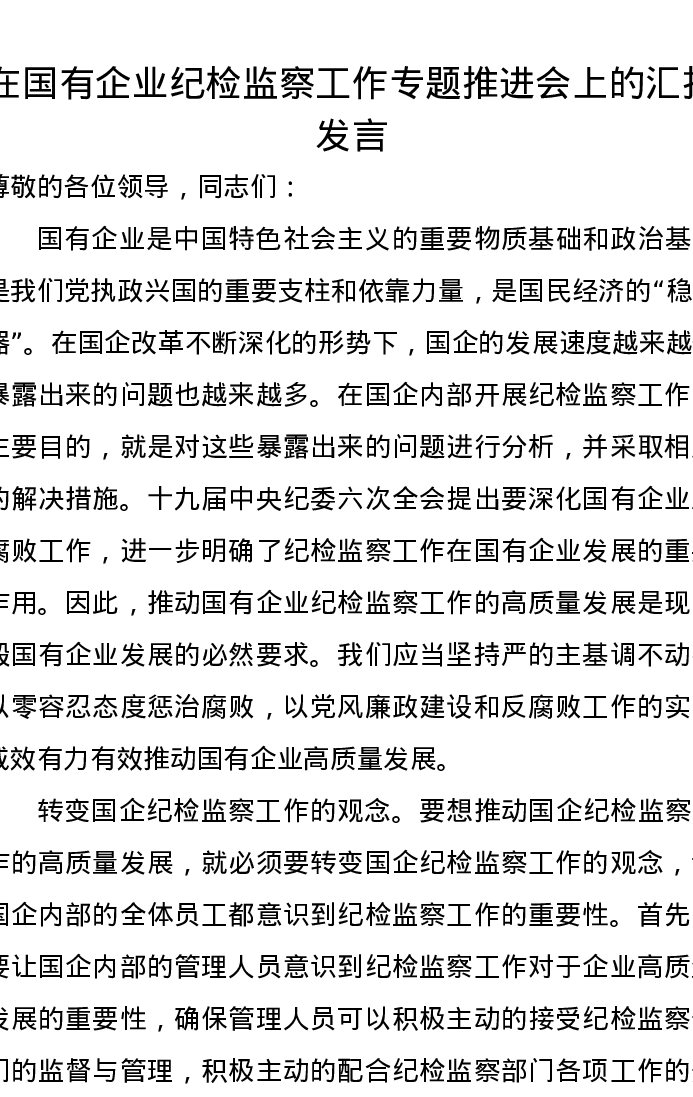 在国有企业纪检监察工作专题推进会上的汇报发言