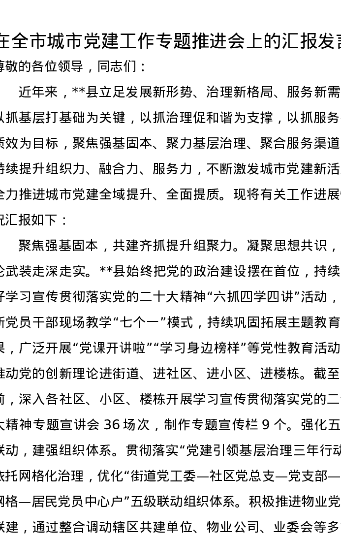 在全市城市党建工作专题推进会上的汇报发言