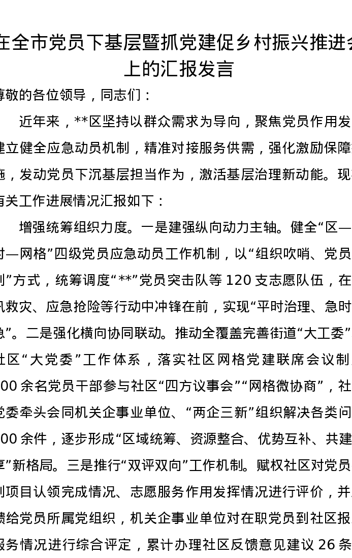 在全市党员下基层暨抓党建促乡村振兴推进会上的汇报发言
