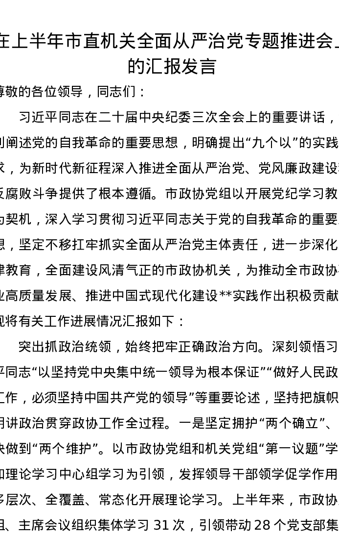 在上半年市直机关全面从严治党专题推进会上的汇报发言