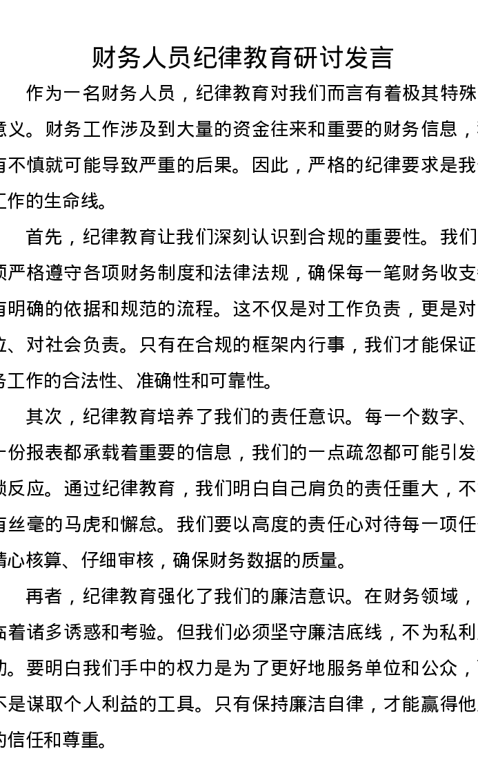 财务人员纪律教育研讨发言