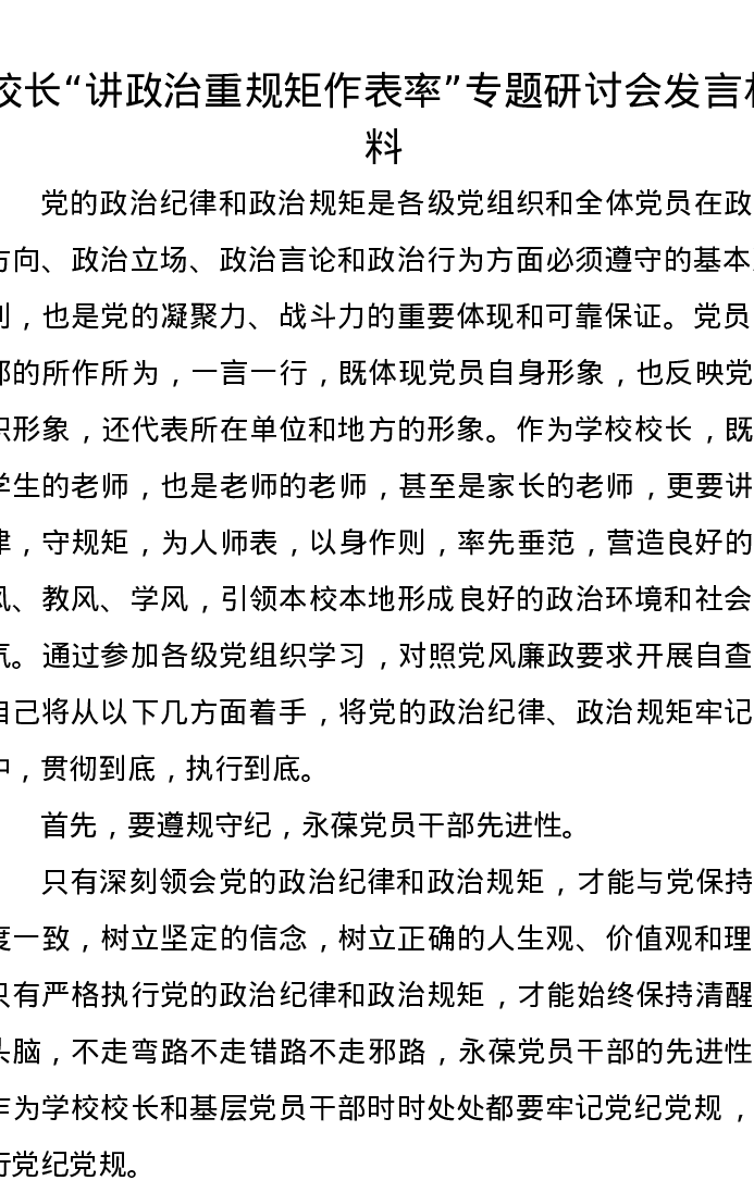校长“讲政治重规矩作表率”专题研讨会发言材料