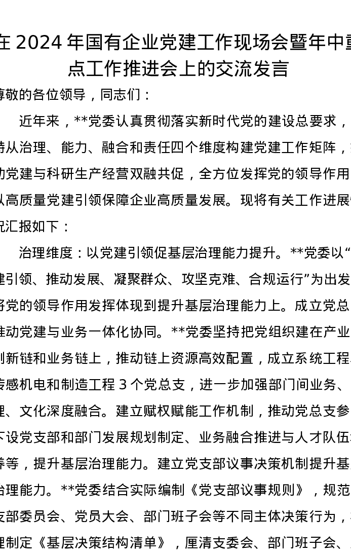 在2024年国有企业党建工作现场会暨年中重点工作推进会上的交流发言
