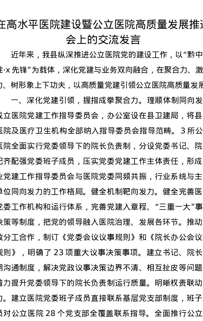 在高水平医院建设暨公立医院高质量发展推进会上的交流发言