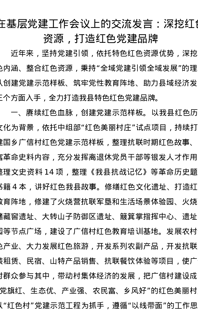 在基层党建工作会议上的交流发言:深挖红色资源,打造红色党建品牌
