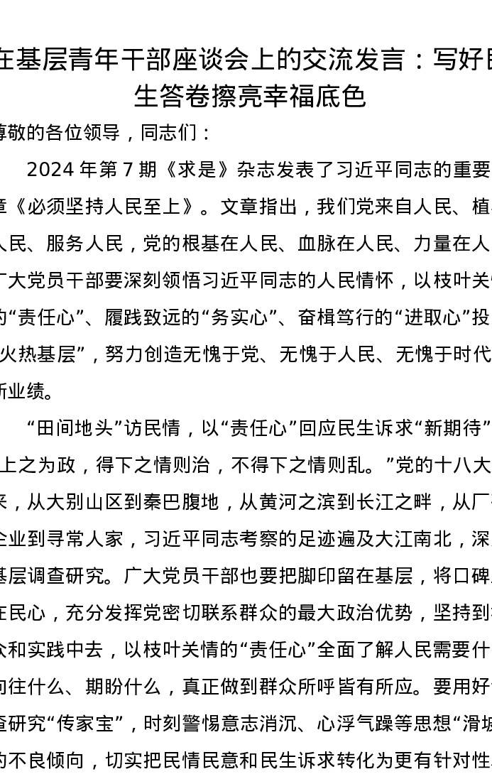 在基层青年干部座谈会上的交流发言:写好民生答卷擦亮幸福底色