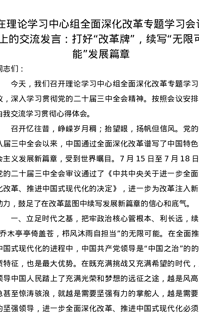 在理论学习中心组全面深化改革专题学习会议上的交流发言:打好“改革牌”,续写“无限可能”发展篇章