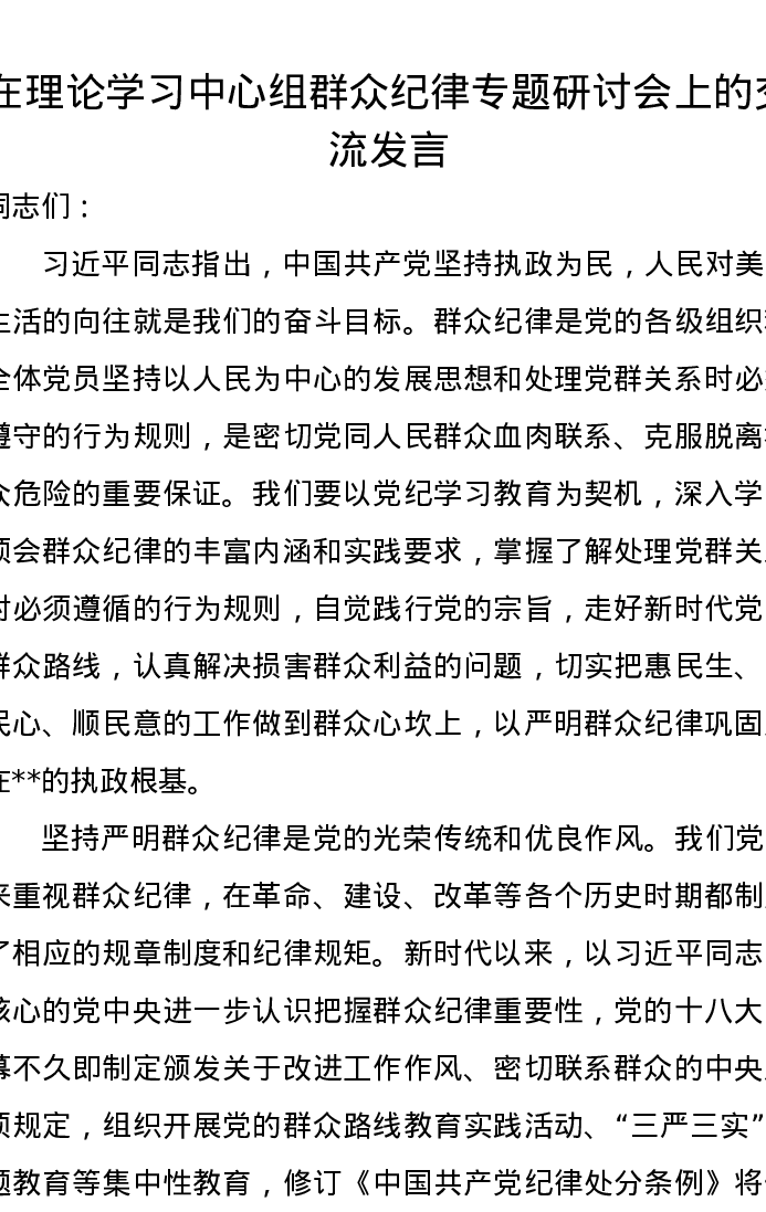 在理论学习中心组群众纪律专题研讨会上的交流发言