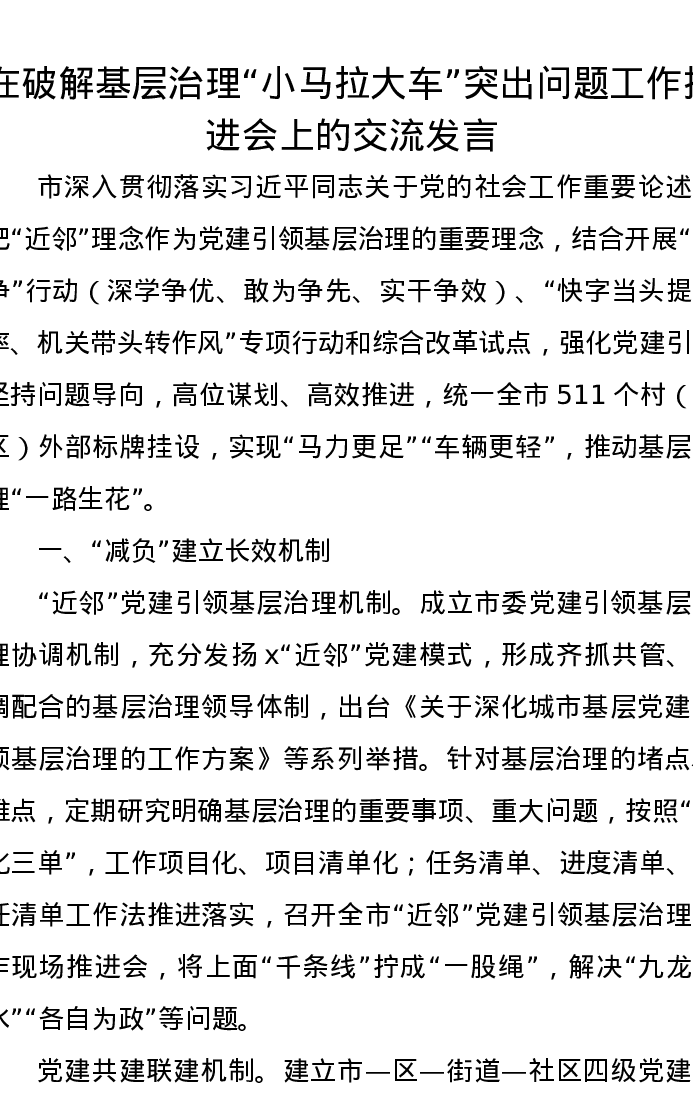 在破解基层治理“小马拉大车”突出问题工作推进会上的交流发言