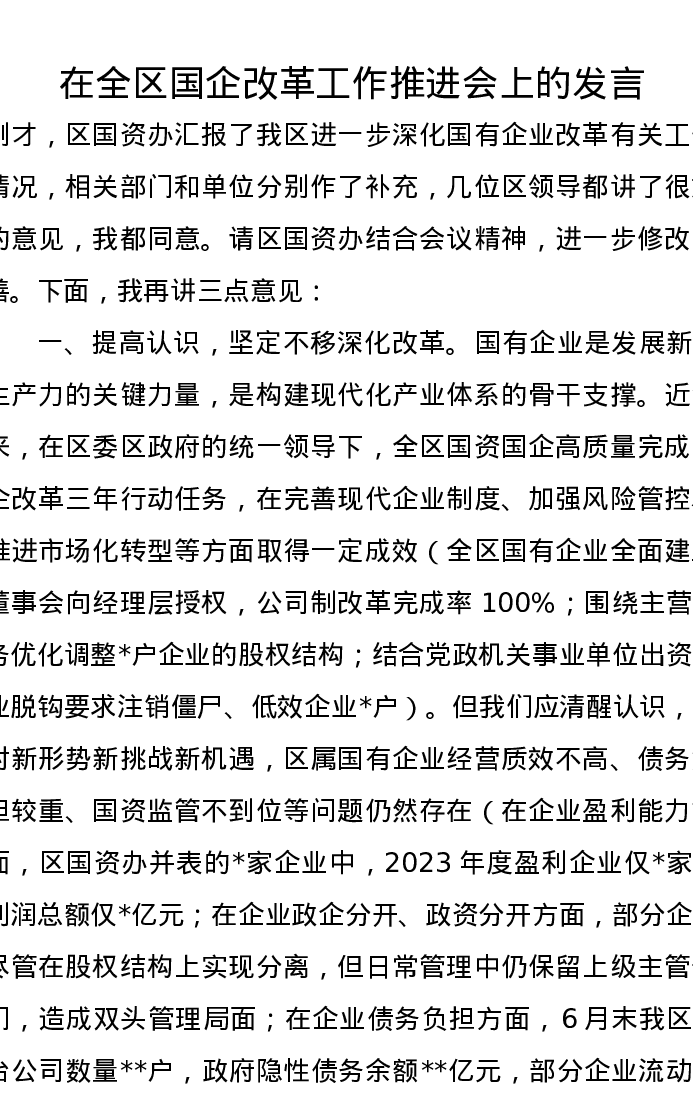 在全区国企改革工作推进会上的发言