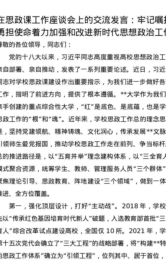在思政课工作座谈会上的交流发言:牢记嘱托勇担使命着力加强和改进新时代思想政治工作
