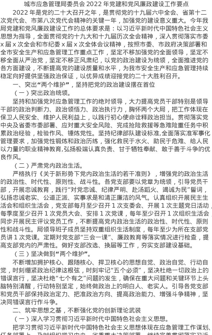 20220419城市应急管理局委员会2022年党建和党风廉政建设工作要点