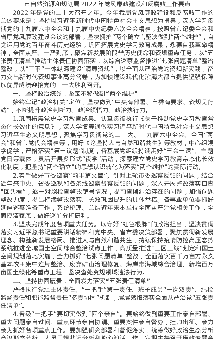 20220421市自然资源和规划局2022年党风廉政建设和反腐败工作要点