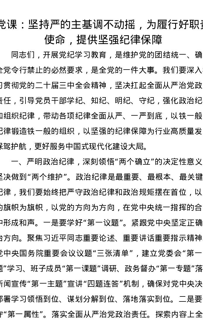 党课讲稿:坚持严的主基调不动摇,为履行好职责使命,提供坚强纪律保障