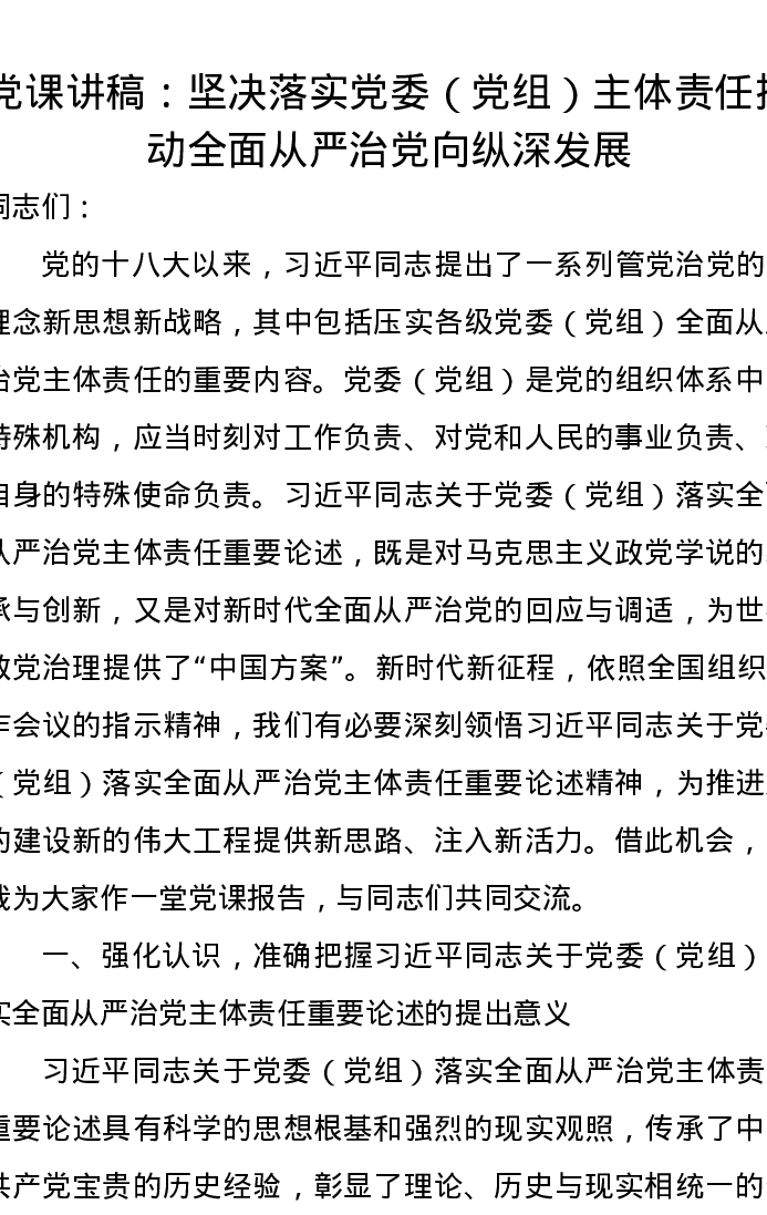 党课讲稿:坚决落实党委(党组)主体责任推动全面从严治党向纵深发展