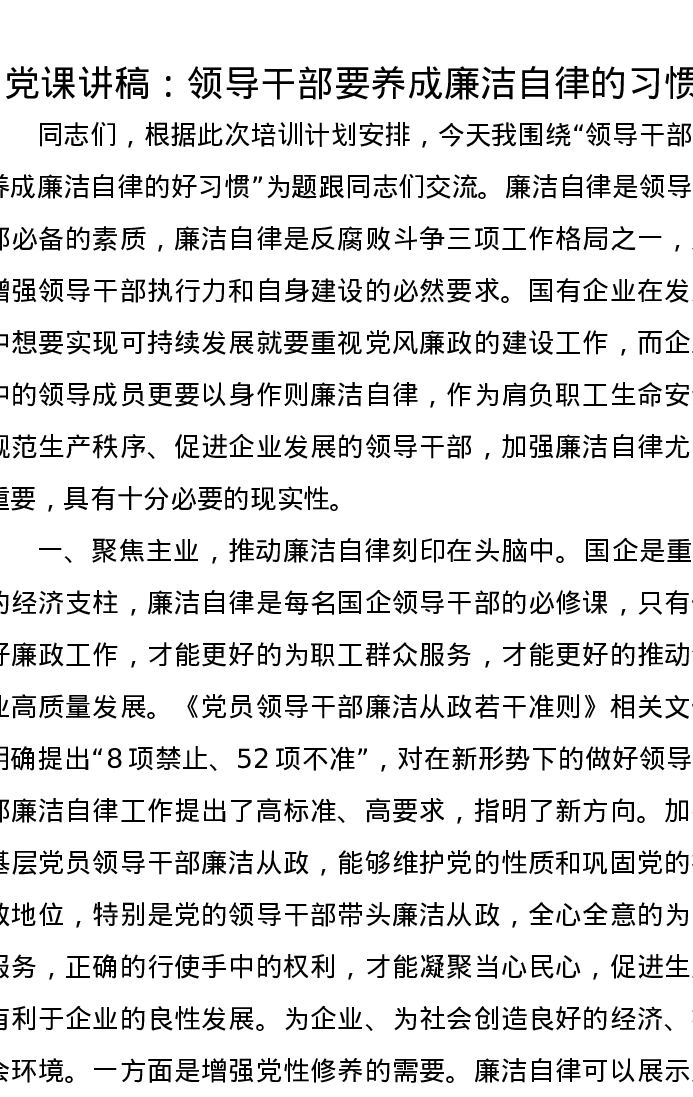 党课讲稿:领导干部要养成廉洁自律的习惯