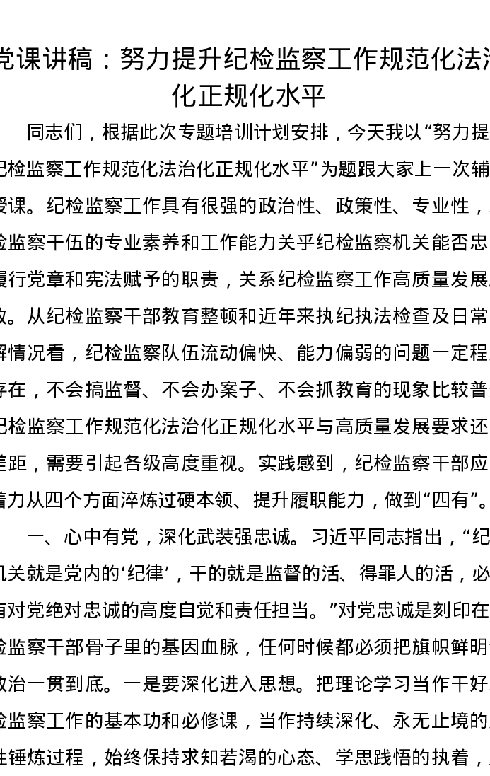 党课讲稿:努力提升纪检监察工作规范化法治化正规化水平