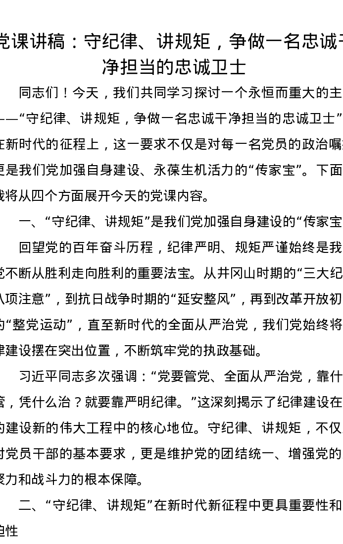 党课讲稿:守纪律、讲规矩,争做一名忠诚干净担当的忠诚卫士
