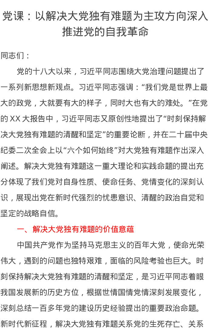党课讲稿:以解决大党独有难题为主攻方向深入推进党的自我革命