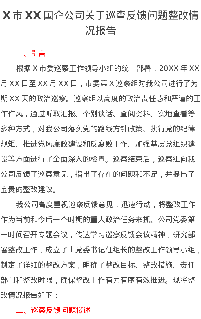 X市XX国企公司关于巡查反馈问题整改情况报告
