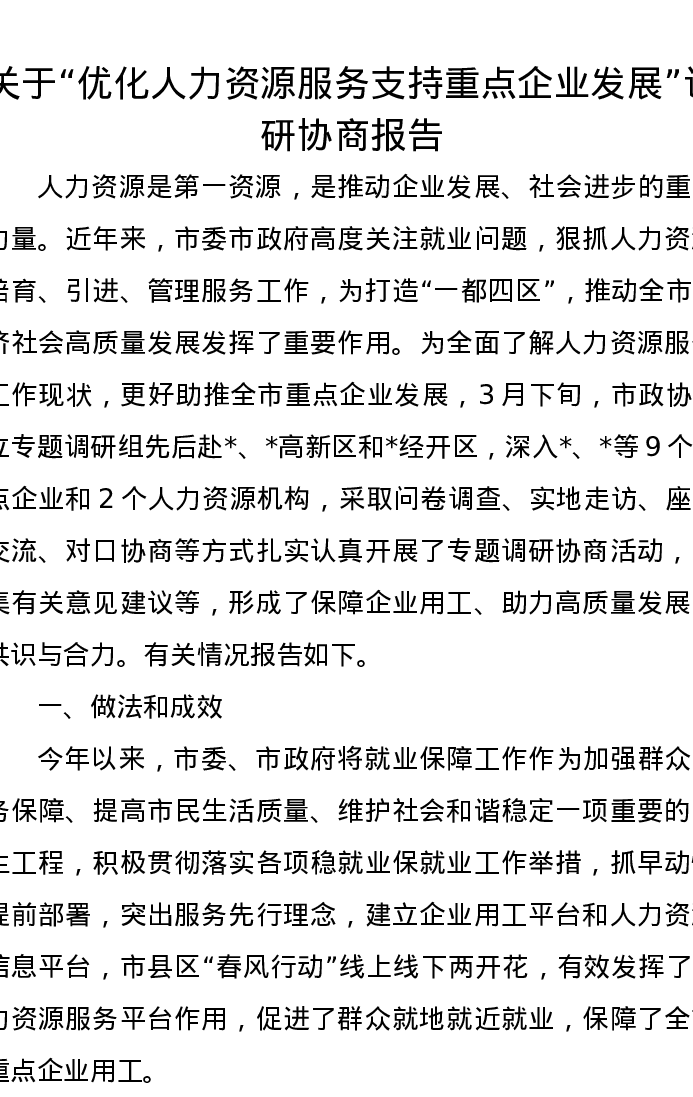 关于“优化人力资源服务支持重点企业发展”调研协商报告