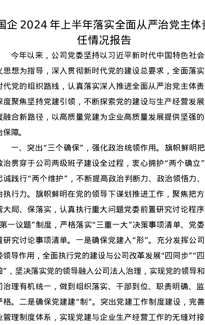 国企2024年上半年落实全面从严治党主体责任情况报告