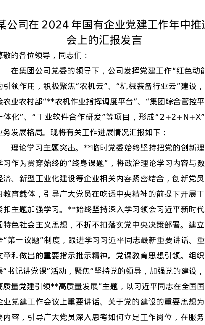 某公司在2024年国有企业党建工作年中推进会上的汇报发言