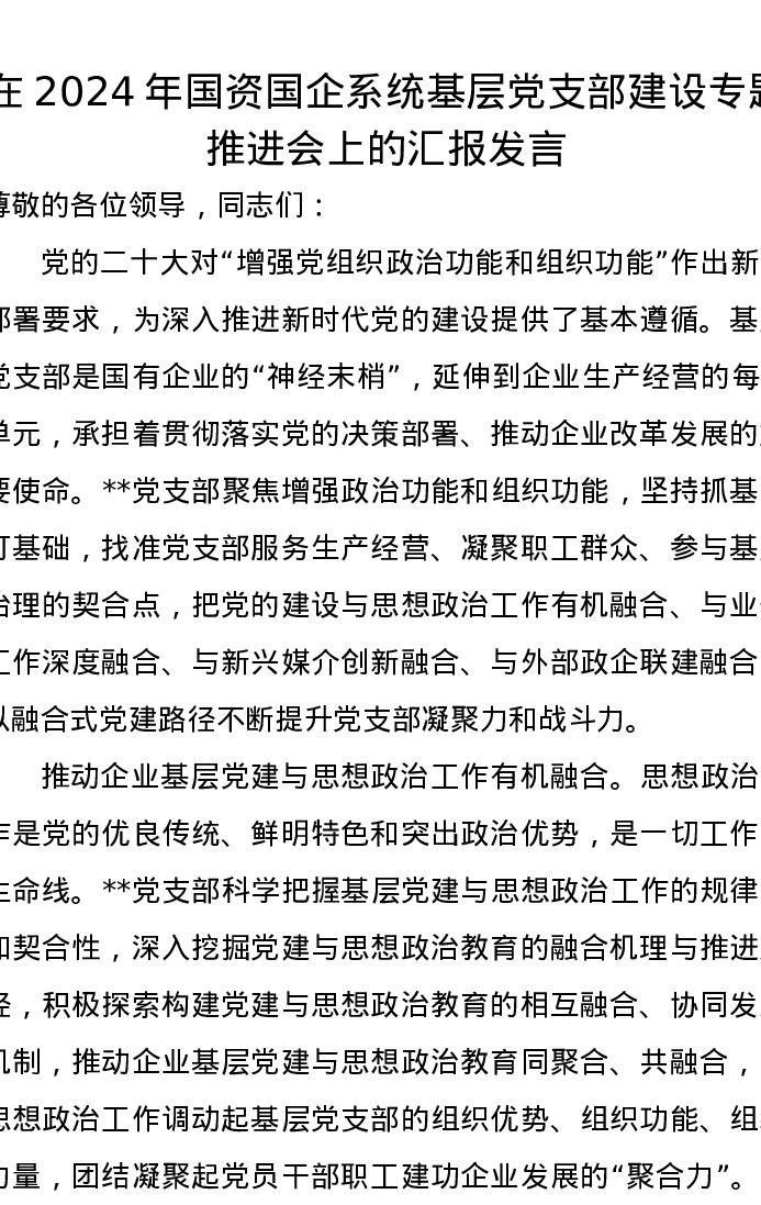 在2024年国资国企系统基层党支部建设专题推进会上的汇报发言