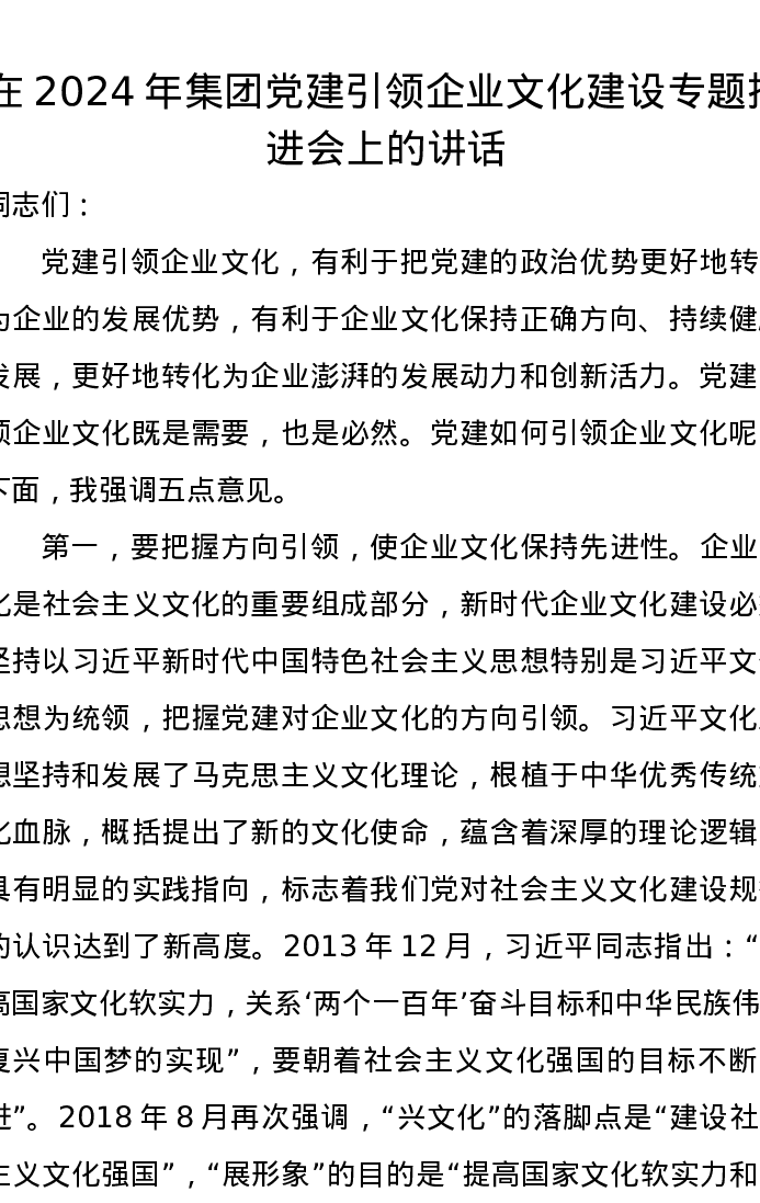 在2024年集团党建引领企业文化建设专题推进会上的讲话