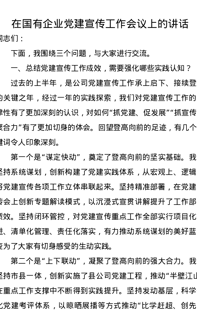 在国有企业党建宣传工作会议上的讲话