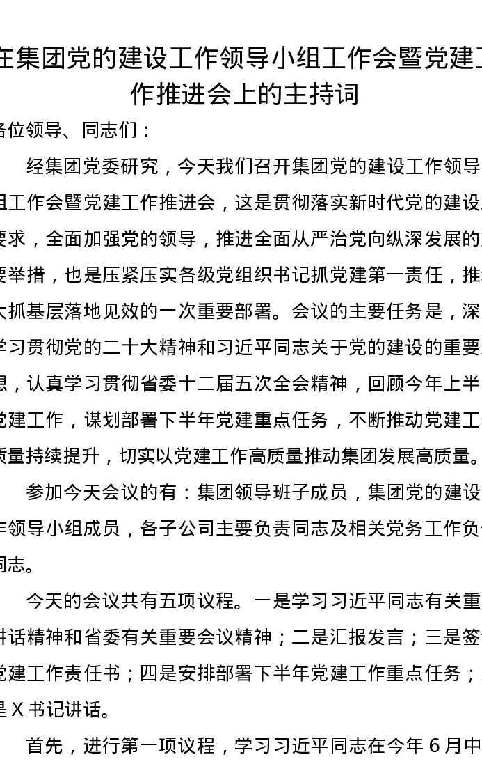 在集团党的建设工作领导小组工作会暨党建工作推进会上的主持词