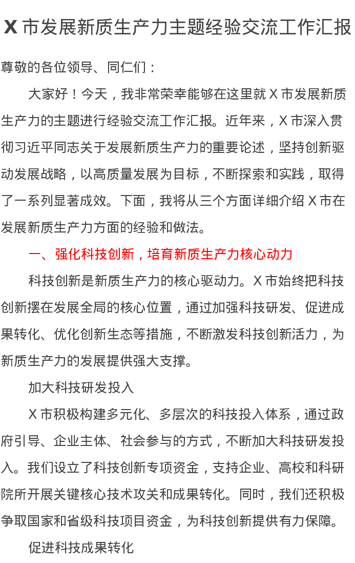 X市发展新质生产力主题经验交流工作汇报