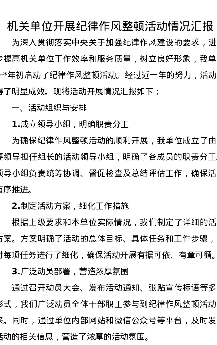 机关单位开展纪律作风整顿活动情况汇报