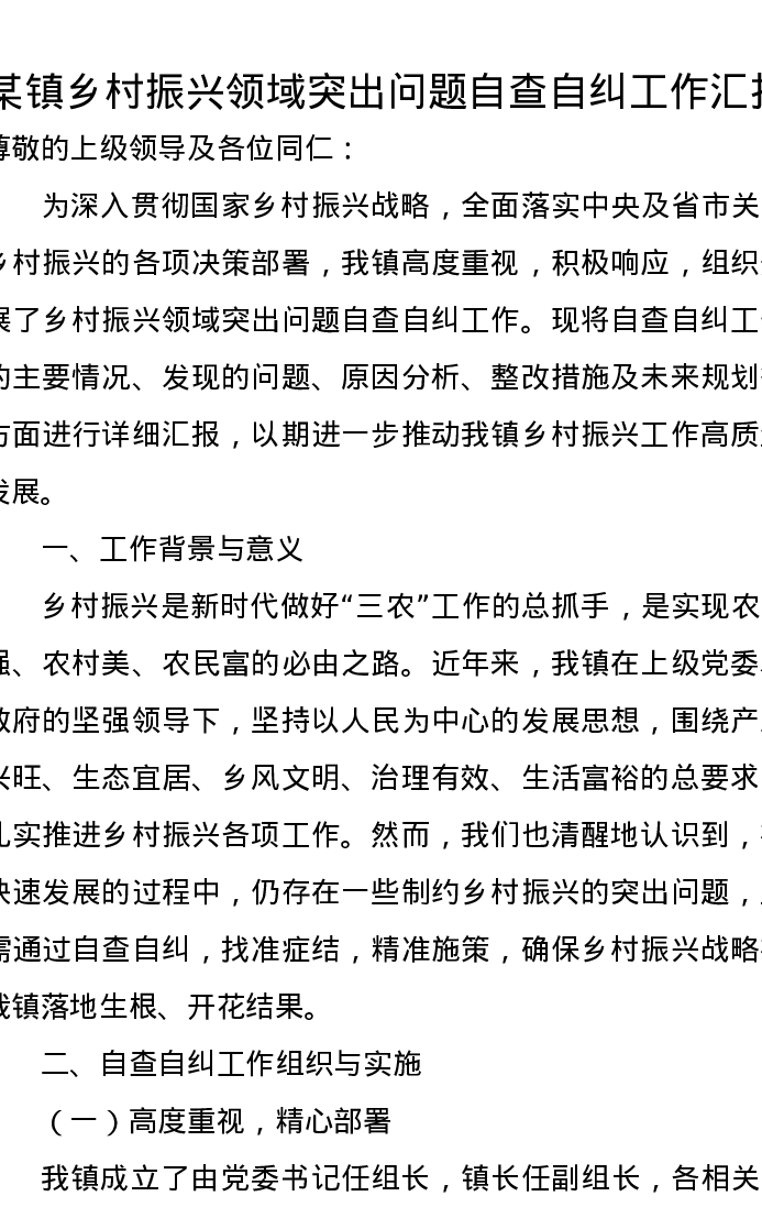 某镇乡村振兴领域突出问题自查自纠工作汇报